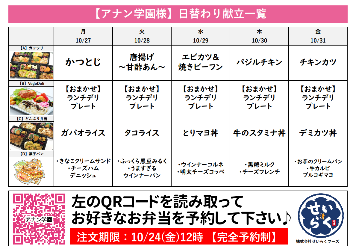 10/27~10/31週間のお弁当メニュー〘せいらく〙