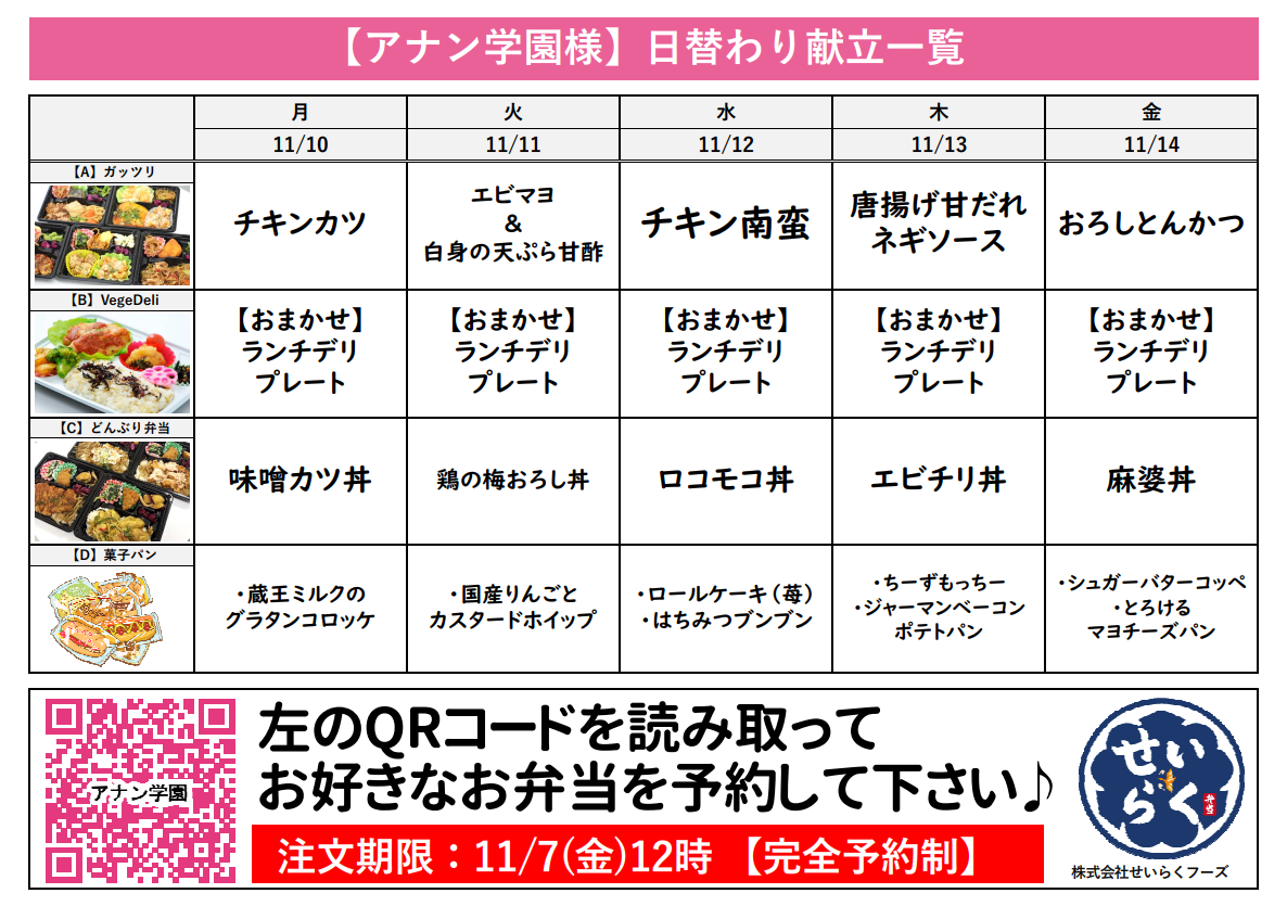 11/10~11/14週間のお弁当メニュー〘せいらく〙 を選択 11/3~11/7週間のお弁当メニュー〘せいらく〙