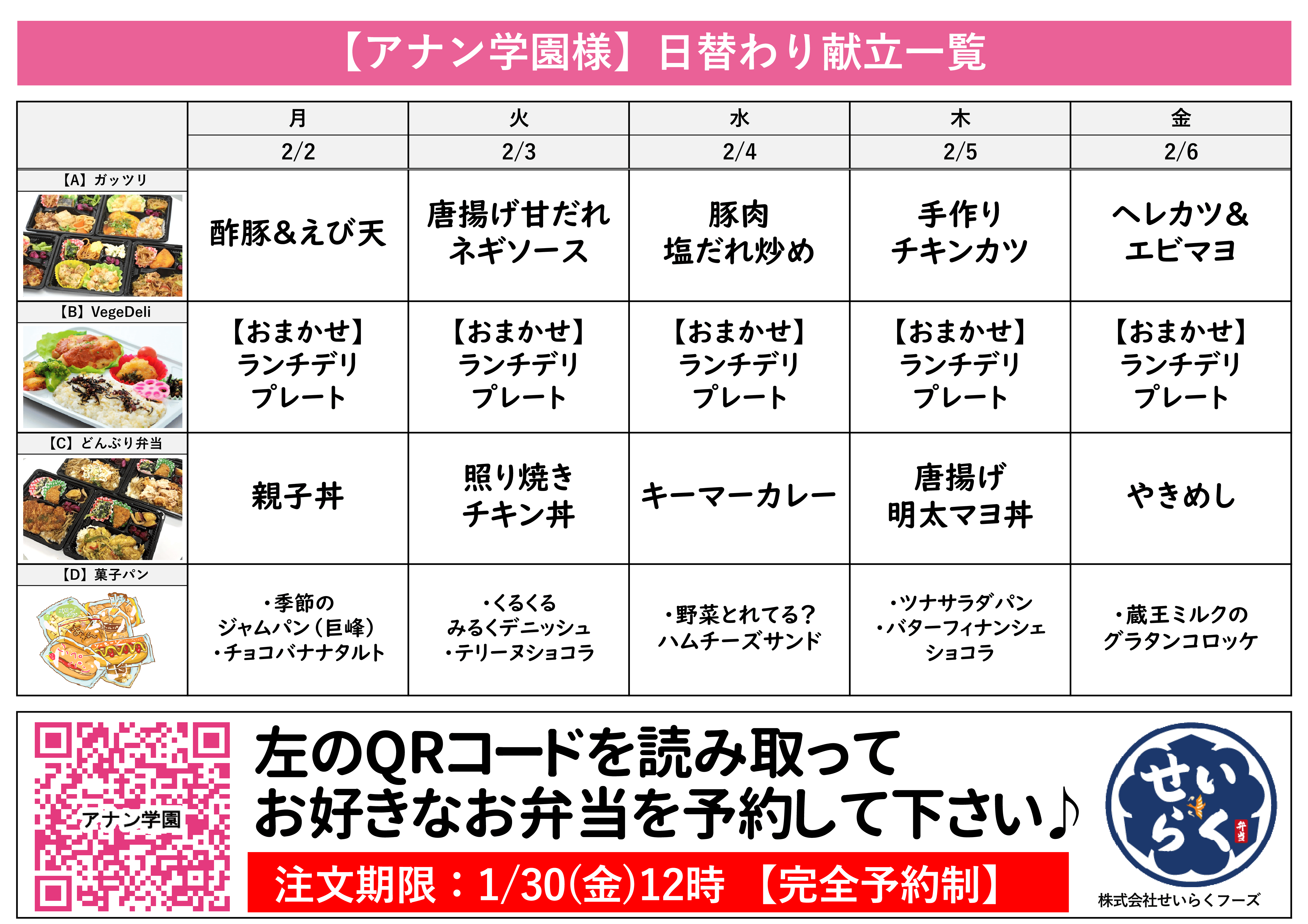 2/2~2/6週間のお弁当メニュー〘せいらく〙