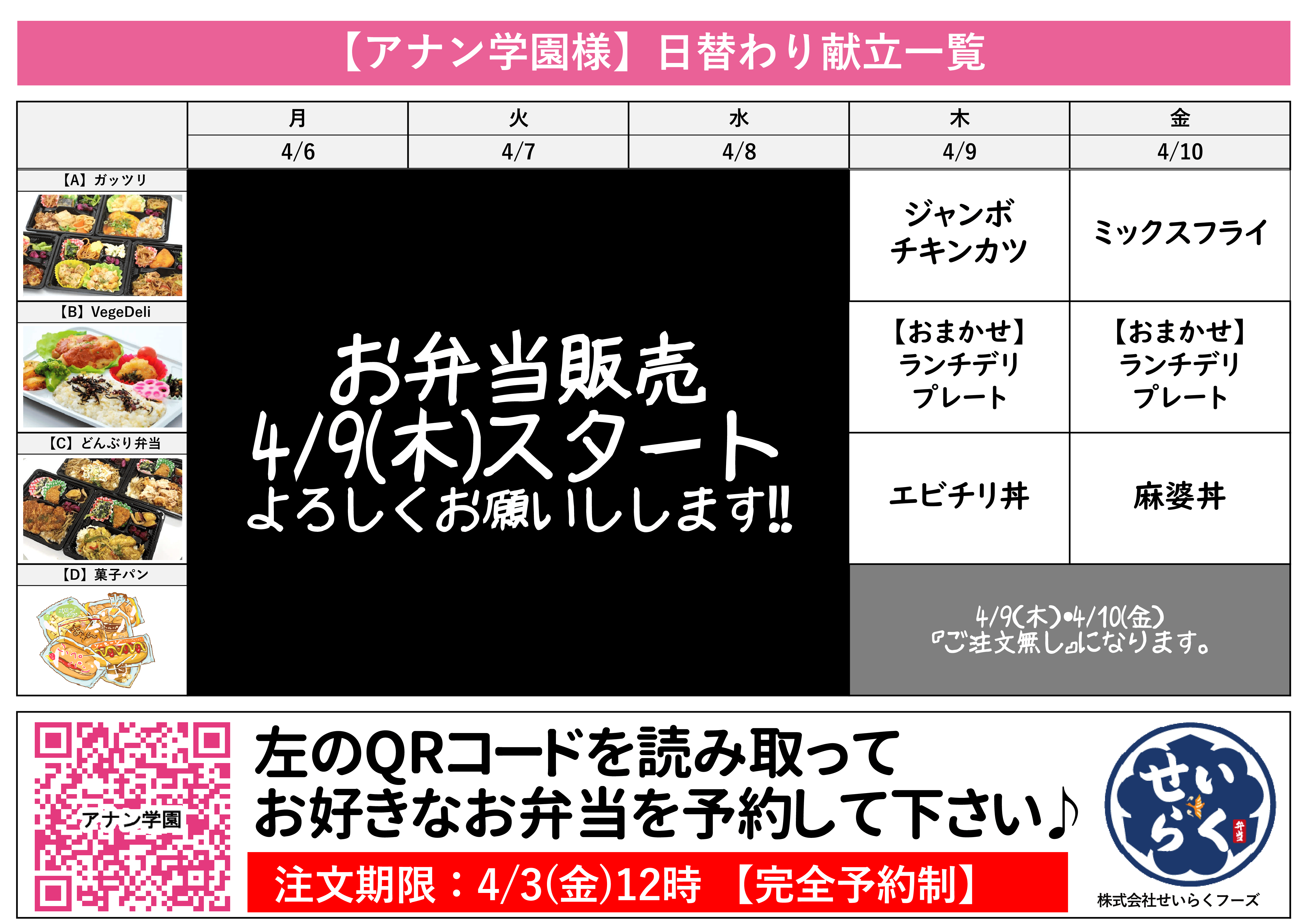 4/6~4/10週間のお弁当メニュー〘せいらく〙