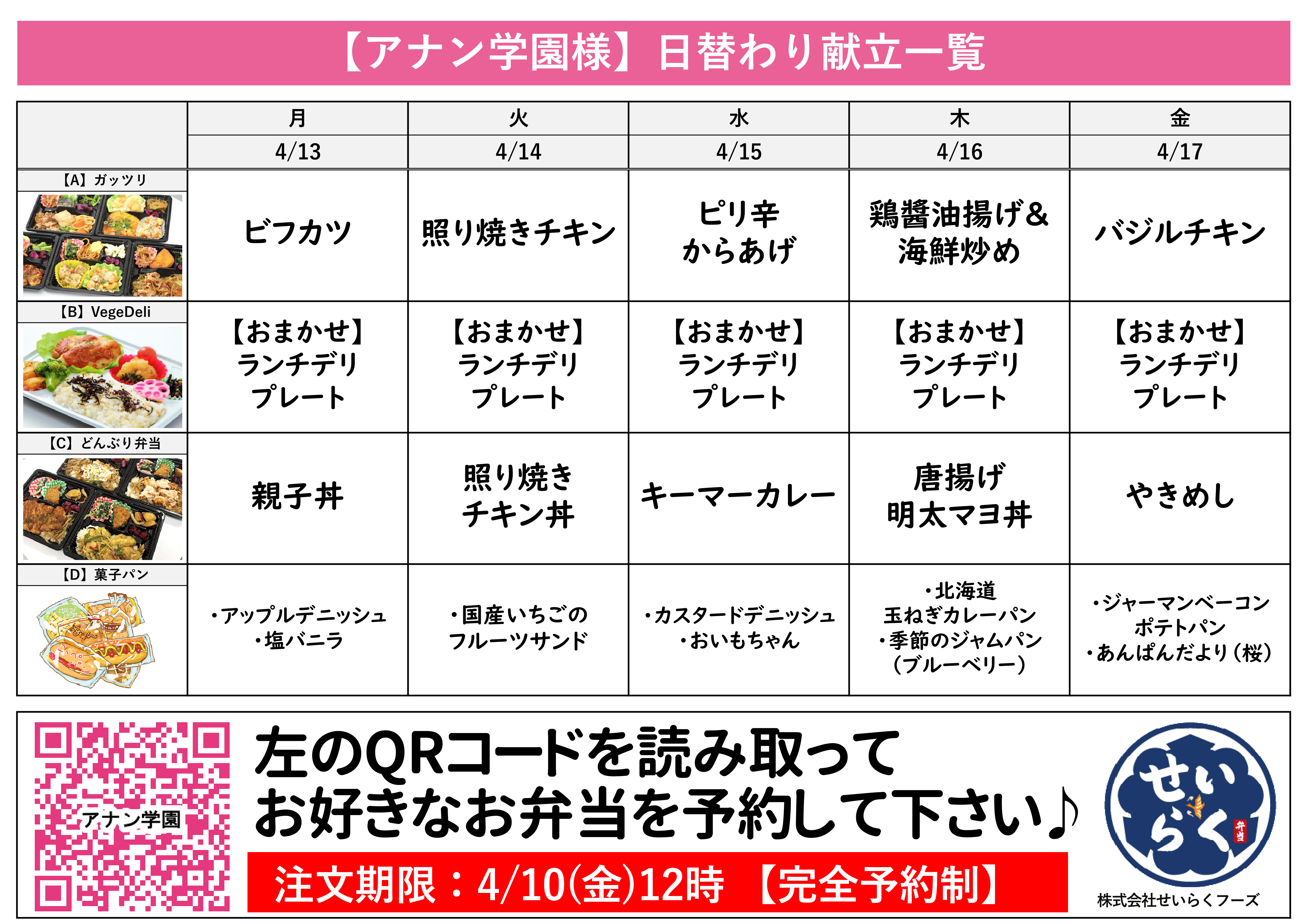 4/13~4/17週間のお弁当メニュー〘せいらく〙